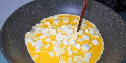 6.炒鍋燒熱轉小火,淋入少許植物油,把雞蛋液和豆腐滑入鍋內,小火慢煎2分鐘,把底部的雞蛋煎至定型。