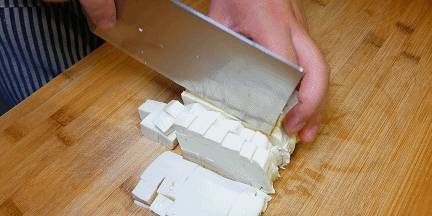2.豆腐我們要選擇嫩豆腐或者內酯豆腐,先切厚片再切長條,最後切成小的豆腐丁。