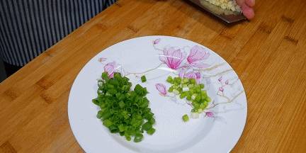 4.小蔥兩根切蔥花,大蒜幾粒拍碎後切蒜末,切好放一起備用。