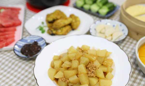 剩瞭一小塊瘦肉,丟瞭可惜炒菜又不夠,幹脆剁碎瞭,配上土豆燒一燒,土豆隻要加一點肉就會增鮮不少,做出來軟糯鮮香,大人孩子都愛吃,做這個菜,不需要太多的調味料,蠔油,生抽,老抽,一點點鹽,雞精足夠,配料可以用點生薑。