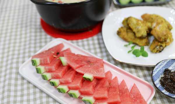 準備瞭一碟西瓜,為瞭不臟手,用瞭個網紅切法,其實一點也不難,就是我們在我們正常切西瓜的步驟上,多瞭去兩端皮的步驟,這樣一來,吃的時候就方便很多瞭,這個切法很實用,也不浪費西瓜,總的下來,一邊煮粥一邊備菜,一個小時輕松搞定一桌,趕快試試吧!