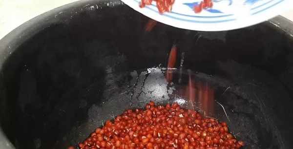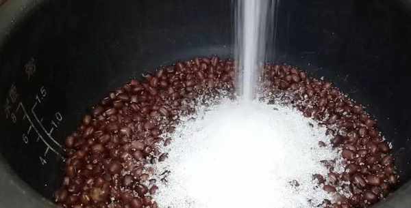 紅豆充分吸水以後,倒入40克的白糖,勺子攪拌一下,繼續吸水燜煮。