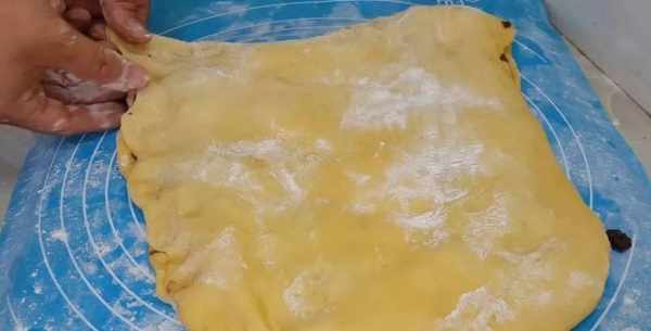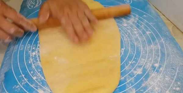 面團揉出面團氣泡,揉成大面團,搟杖按壓一下,搟成薄片狀。