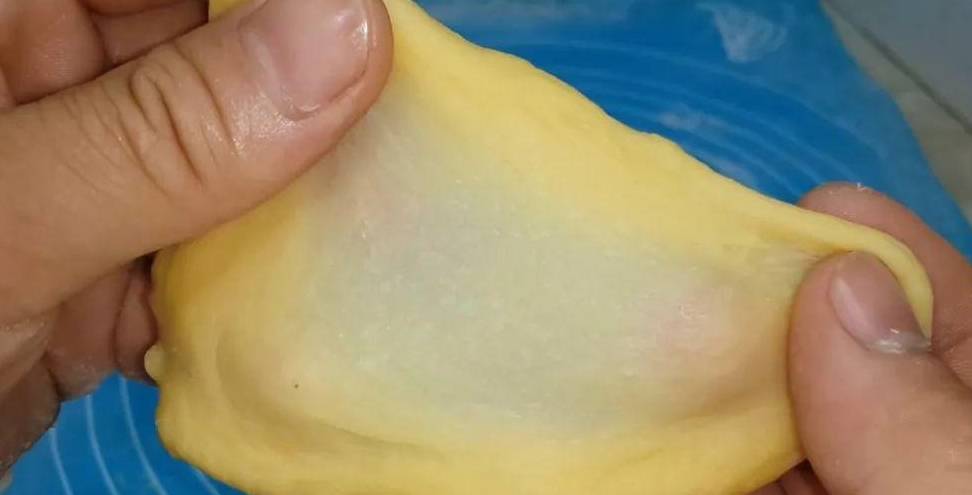 揉至光滑不沾手,揉八分鐘以後,即便普通面粉,也能揉出薄膜。