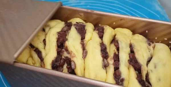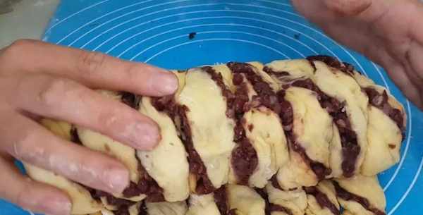 面包從底部卷起,卷成紅豆面包。