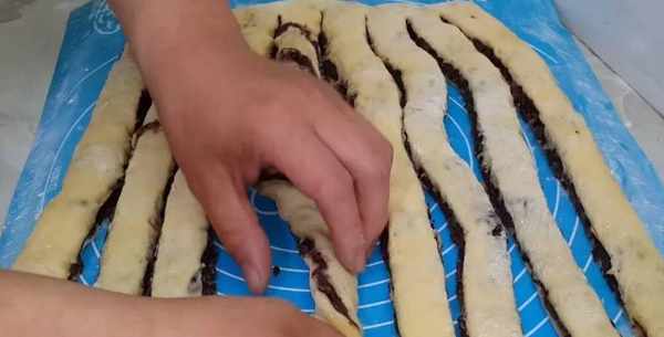面包切成寬寬的面條,扭一扭成麻花狀。