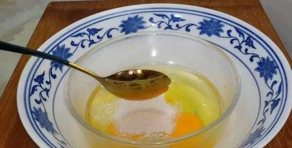 打入四個雞蛋,三克的酵母,10克白糖促進發酵。