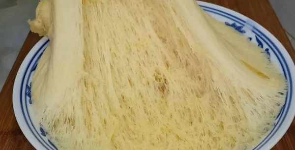 面包發酵40分鐘以後,取出保鮮膜,發酵至蜂窩拉絲狀,就說明面包已經成功瞭。