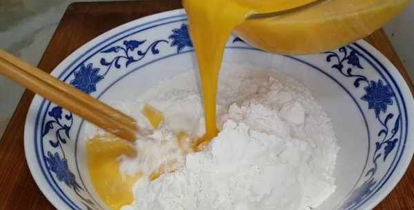 加入300克的普通面粉,倒入雞蛋液和面,邊倒入邊攪拌。