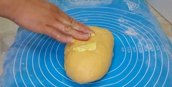 面團放入案板,將玉米油揉進面團,最後加入15克黃油。