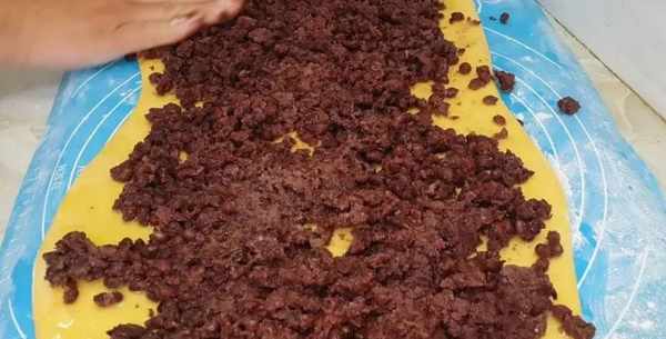 面餅刷上少許油,倒入紅豆餡料,並且按壓普通。