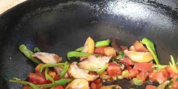 5、由於豆腐已經提前炸過瞭,為瞭保證所有的配菜都可以煮熟,現在我們要先把菜下鍋炒一下配菜。起鍋燒油,放入蔥花炒香,然後放入切好的番茄丁,炒出汁水。接著加入香菇,青椒翻炒一下。