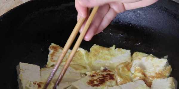 4、接著,起鍋燒油,放入準備好的豆腐,煎一下。我們在把豆腐的底面被煎黃之後,翻一面,繼續煎炸;最後將豆腐的兩面煎至金黃,關火,將豆腐撈出鍋,待用。