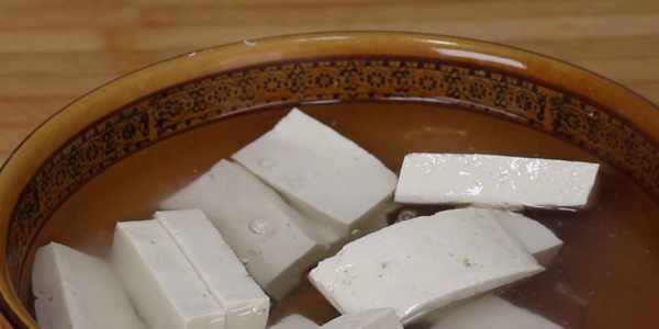 1、首先,我們將買來的豆腐切成薄片,放入碗中。薄片方便我們將豆腐做熟,還可以方便我們燙掉豆腐裡的豆腥味。切片之後,向碗裡放入開水,將豆腐浸泡一下,去除豆腐的豆腥味。直接買來的豆腐豆腥味會很濃,需要用開水將其洗掉。