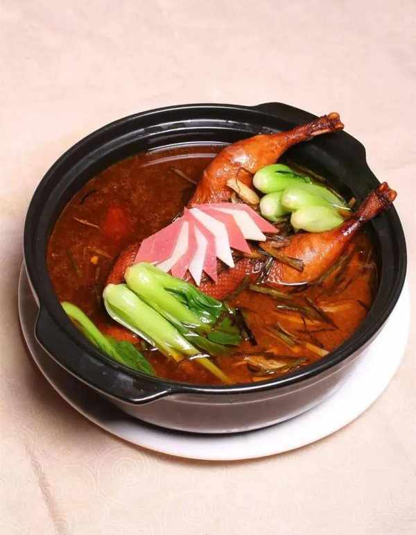 是江蘇蘇錫地區傳統名菜,屬於蘇菜系。在一百多年前,太湖遊船眾多,船傢都在船上煮飯燒菜,供遊客食用。船傢用整隻鴨子,在陶罐中煨制,原汁原湯,香味濃鬱,肉質酥爛不碎,深受船客歡迎。因當時此菜尚無正式名稱,遊客稱它為“船鴨”。此菜近百年來已成為太湖菜中最著名的傳統名菜。如今,在蘇州、無錫和上海許多蘇錫菜館中均有供應。