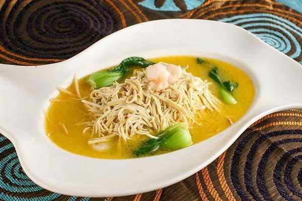 揚州好,茶社客堪邀。加料千絲堆細縷,熟銅煙袋臥長苗,燒酒水晶肴。”上為清代惺庵居士《望江南》詞,形象生動地描繪瞭清代揚州的居民品嘗“加料幹絲”的情景,頗似一幅生動的風俗畫。清代乾隆皇帝六下江南,揚州地方官員曾呈上“九絲湯”以“寵媚乾隆”。“九絲湯”系用幹絲外加火腿絲、筍絲、銀魚絲、木耳絲、口蘑絲、紫菜絲、蛋皮絲、雞絲烹調而成,有時還外加海參絲、蛭幹絲或燕窩絲。又因豆腐幹本身滋味很薄,要想入味,必需借用滋味鮮醇的雞汁,多種佐料的鮮香味經過烹調,復合到豆腐幹絲裡,吃起來爽口開胃,異常珍美,令人食之不厭。現今大煮幹絲,比之“九絲湯”,已有瞭很大發展,以幹絲、雞絲為主,幹絲潔白,外加鮮蝦仁,綴以各種配料,稱為什錦幹絲,色彩美觀,其味更鮮。 “大煮幹絲”刀工要求極為精細,“鸞刀應俎,霍霍霏霏”,一塊白幹,廚師經加工可片成18片,切出的幹絲不僅整齊、均勻,而且其粗細不能超過火柴桿。增色添香。大煮幹絲不僅譽滿全國,而且被國外來賓譽之為“東亞名肴”。由於“煮幹絲”、“燙幹絲”既富有營養,又味美、清淡,所以深受廣大顧客的歡迎。如今,到揚州的遊客,每每要點上一盤“大煮幹絲”或“燙幹絲”。有些老食客幹脆就是一壺香茗、一份幹絲,別的什麼也不要,足見幹絲的誘人魅力瞭。二零零八年,幹絲制作技藝,被揚州市政府批準為該市第二批非遺名錄。