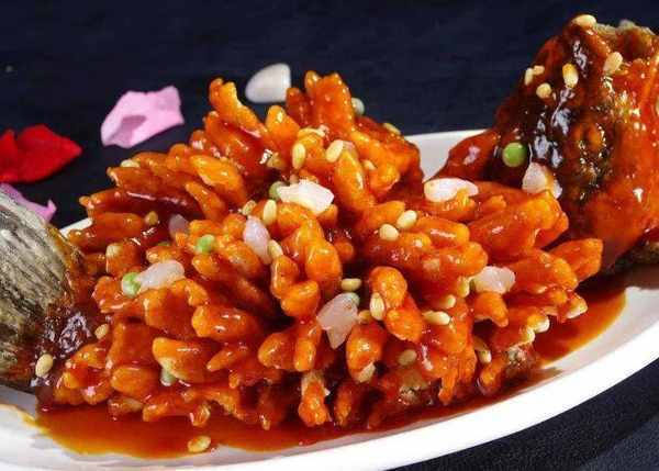 又名松鼠鱖魚,是江蘇省蘇州市地方傳統名菜。當炸好的鱖魚(或桂魚)上桌時,隨即澆上熱氣騰騰的鹵汁,它便吱吱地“叫”起來,因活像一隻松鼠而得名。松鼠桂魚的前身是松鼠魚。清代《調鼎集》中有記載為:取鮪魚肚皮,去骨,拖蛋黃炸黃,作松鼠式。這道菜成菜後,形如松鼠、外脆裡嫩、色澤橘黃,酸甜適口,並有松紅香味。