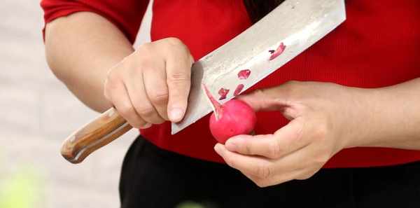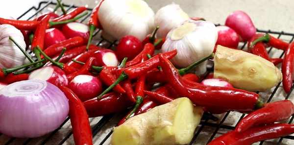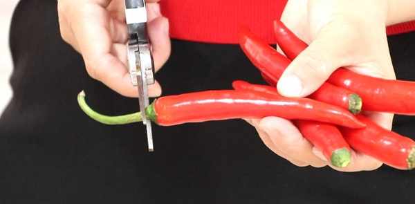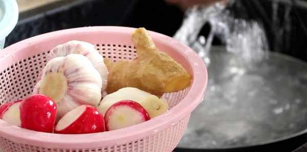 白蘿卜、櫻桃蘿卜去頭尾,小米椒、紅線椒去根部,切去大蒜的根部,撕掉外皮。