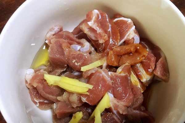 2、把切好的瘦肉放在碗裡,加入一點花生油,生薑,料酒和薑絲,攪拌均勻後醃制十分鐘,讓瘦肉更好地入味。