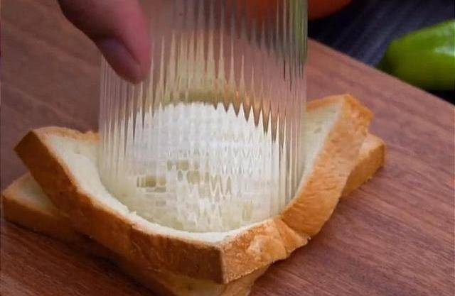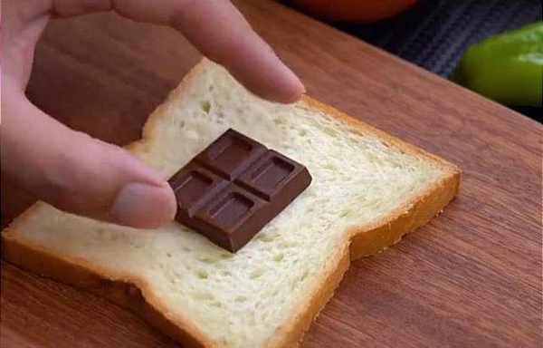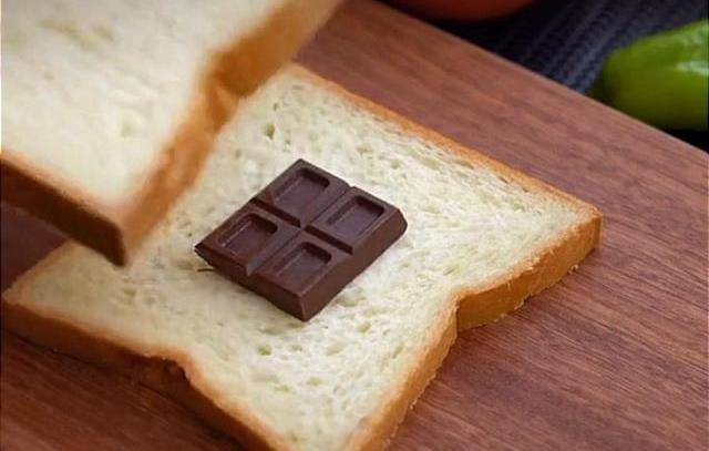 首先,案板上先放一片面包,再在面包片上放一塊巧克力,隨後再蓋上一片面包,取一個玻璃杯,使勁壓出一個圈圈,這樣巧克力就被面包很好的包裹起來瞭,並且還非常的嚴實。