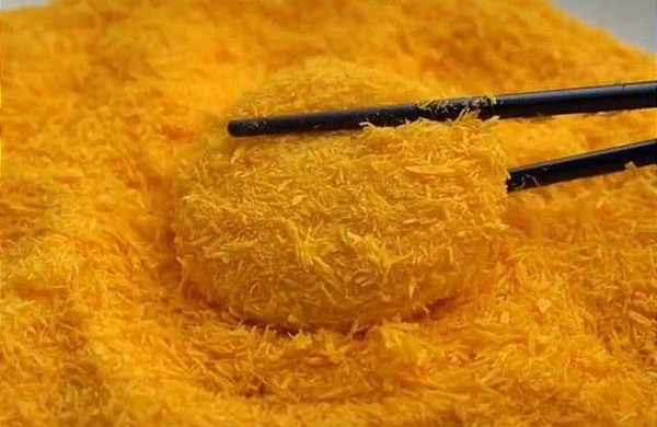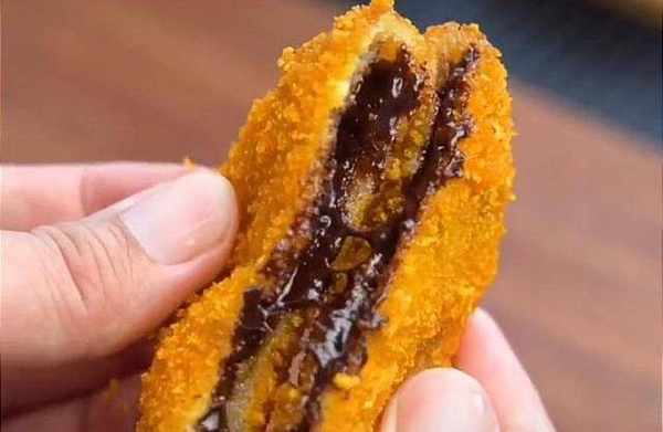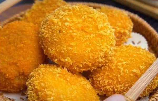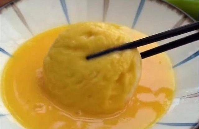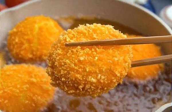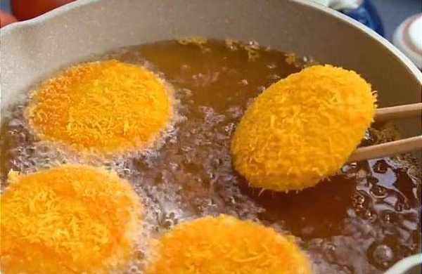 然後,鍋中倒入稍多一點的食用油,油溫六成熱時,拿一個生坯先沾一層雞蛋液,再裹面包糠,壓一壓,防止面包糠脫落。放入鍋內,小火慢炸,炸至金黃色,巧克力派就做好瞭。