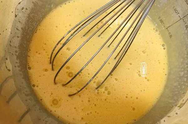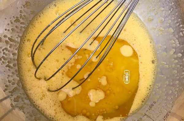 4、把30克的細砂糖加入到蛋黃裡攪打一會,再加入玉米油或沙拉油攪打至融合。