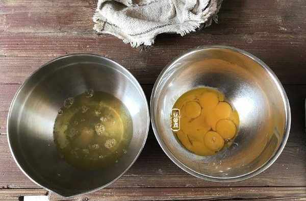 3、我的演示是制作兩個戚風的量,方子是一個的量要註意。把雞蛋的蛋白、蛋清分離至幹凈無水的盆中