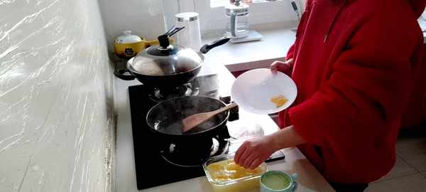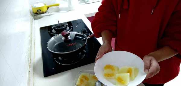3.等鍋裡的液體逐漸變得濃稠透明之後,小心地倒入容器中,再放入剝好的橘子肉,放陰涼處等它涼透之後(著急吃的話也可以放進冰箱冷凍室,大概冷凍15分鐘左右就可以瞭),就會變得冰冰透透的。然後小心地把它切開從容器裡取出裝碗或裝盤之後,軟軟彈彈又香甜的橘子果凍就可以吃啦!