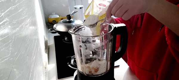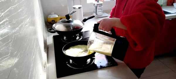 2.先把橘子去皮、和白糖、玉米淀粉一起加適量的清水打碎拌勻備用。然後開火,把拌勻的液體倒入平底鍋裡用鍋鏟不停地攪拌。