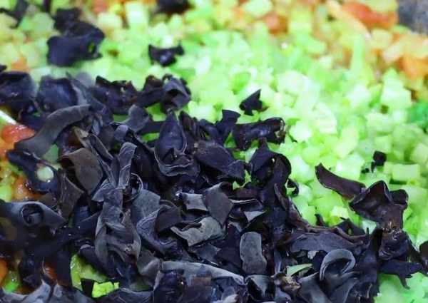 西紅柿炒出湯汁後,把芹菜丁和木耳放入進來