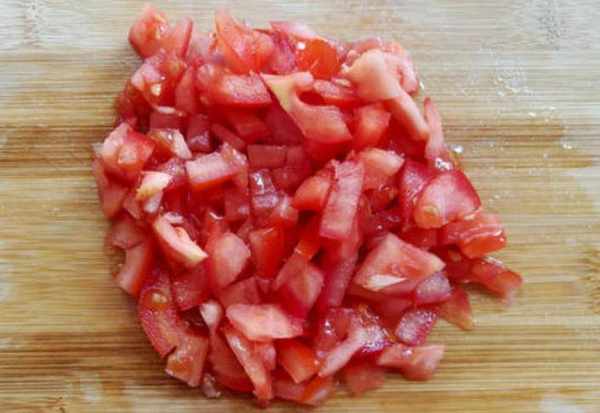一個漂亮的西紅柿,去皮後先切片,任何切成條,最後切成丁