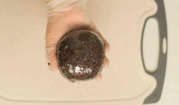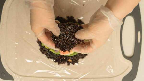 5.再放上一片紫米在飯團的頂部,用保鮮膜裹起來,擰緊。