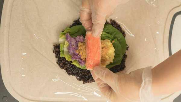 4.依次鋪上生菜、雞蛋醬、芋泥、煮熟或即食蟹柳、肉鬆。
