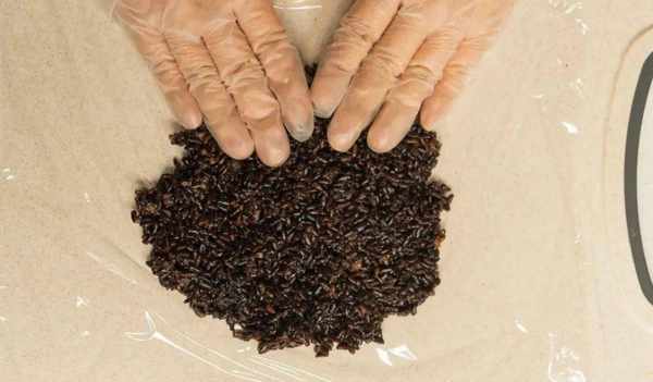 3. 蒸好的紫米平鋪在保鮮膜上。