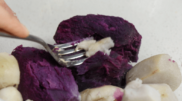 1. 提前一晚泡發紫糯米,放入電鍋內,加入高於米2釐米的水蒸熟。紫薯和芋頭蒸好去皮,碾成泥混合。