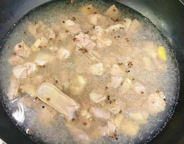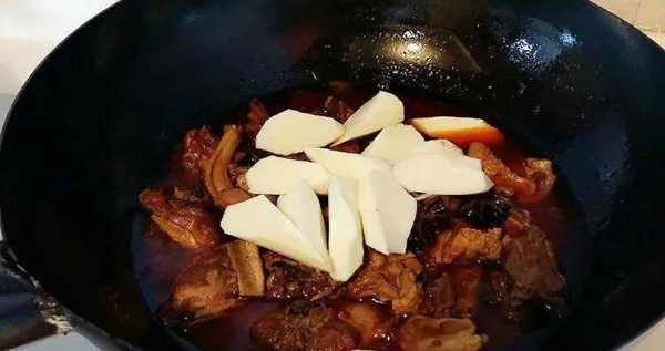 7.倒入高壓鍋中煮10分鐘,10分鐘後再倒回炒鍋中,加入山藥,慢火燜幾分鐘至山藥熟透,這時湯汁也收得恰到好處;