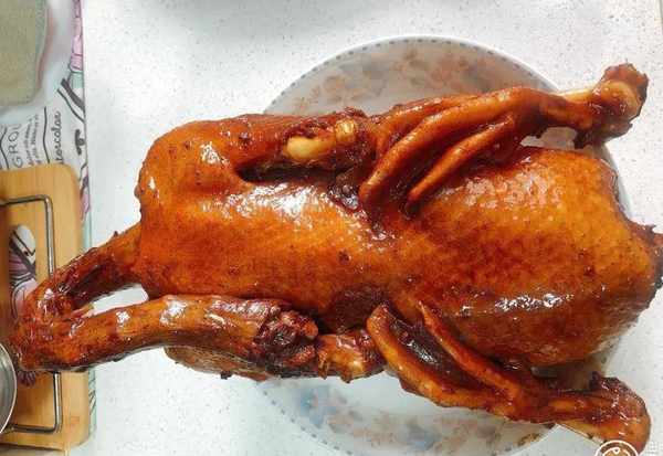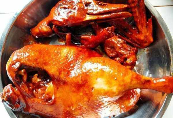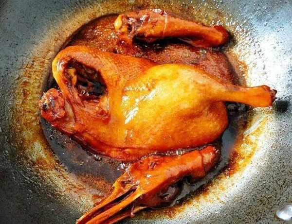 6.不停地翻身和淋醬汁的過程中,鴨子終於熟透瞭,最後大火收汁出鍋;