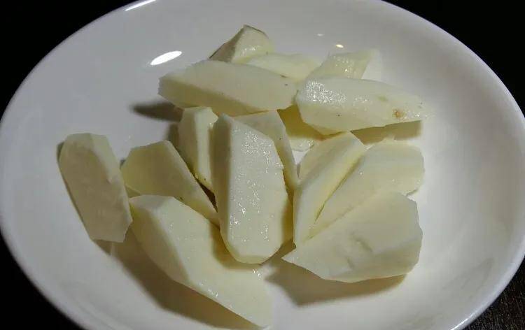 3.鐵棍山藥去皮清洗幹凈,切滾刀塊,用清水泡去粘液備用;