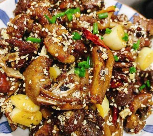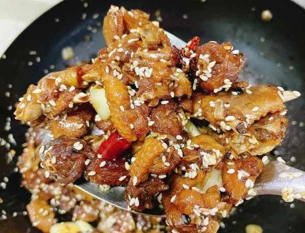 食材:鴨肉、薑片、大蒜、幹辣椒、白芝麻、蔥花