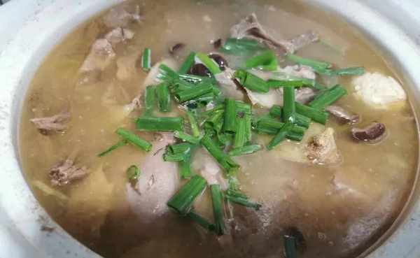 7.最後出鍋前撒上小蔥花點綴,一道營養滋補的茶樹菇老鴨湯就做好啦。