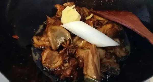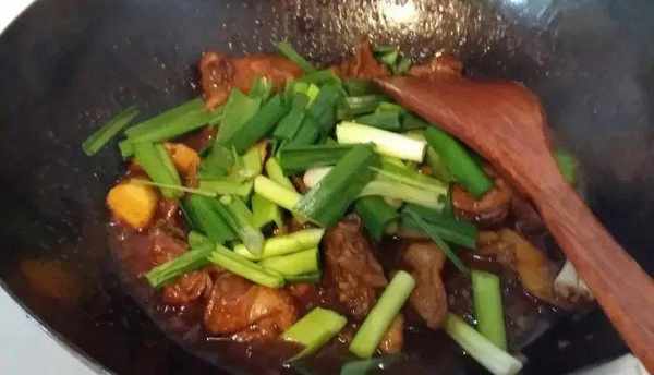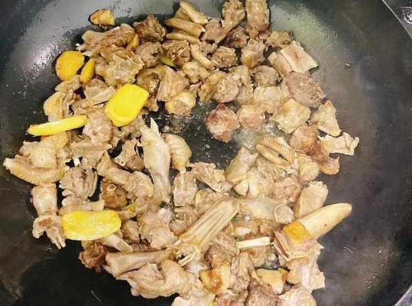 起鍋燒油,油溫7成熱時,將瀝幹水分的鴨腿塊倒入鍋中煸炒,煸炒至發黃時就可以;
