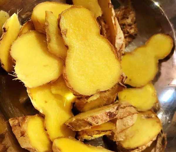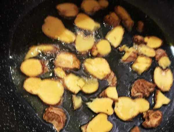2.砂鍋中倒油,鋪上薑片,在鋪薑片的時候就可以開火瞭,小火不然會燙到手;