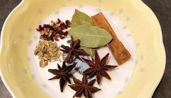 碗中放入花椒、八角、桂皮、香葉、小茴香,其中花椒和八角最重要,其它香料沒有的話可以不放;