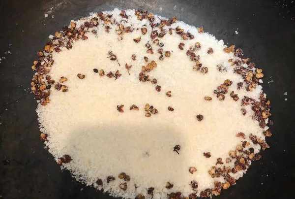 在炒鍋裡加入一勺花椒、5勺鹽,中火炒2分鐘,炒到鹽變成淡黃色就可以瞭;