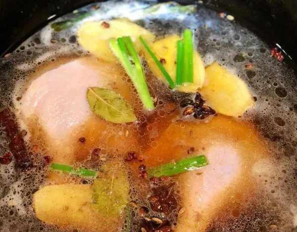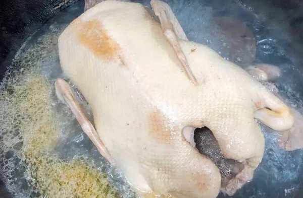 鍋裡加適量的水,整隻鴨子冷水下鍋,煮出浮沫後將浮油和油沫,撈出來繼續煮5分鐘,這樣的水非常幹凈;