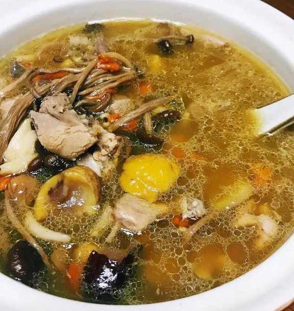6.加入枸杞燉半小時,中間撇去多餘浮沫,放入泡好的茶樹菇,繼續燉50分鐘一般的老鴨這時候已經燉爛瞭,不爛可以再燉一會兒;
