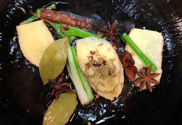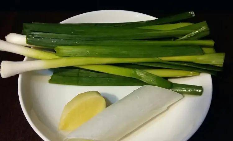青蒜、大蔥段整段(方便挑出來)、生薑清洗幹凈後拍扁備用;
