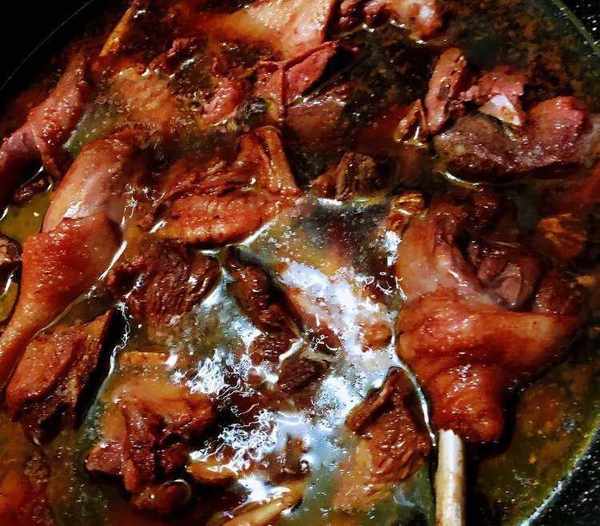 5.燜幹再加水煮幹如此反復三次,收幹三次水分後的鴨子,鍋底出油;