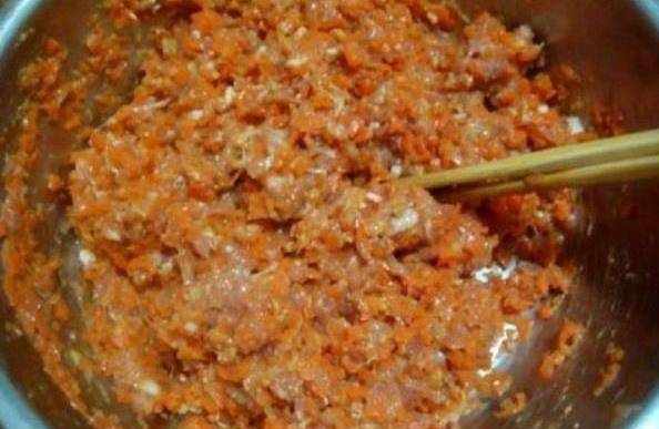 2、然後加入蔥薑末,倒入料酒和醬油攪拌均勻,胡蘿卜洗幹凈切成薄片,然後放到熱水中焯一下水,之後撈出來瀝幹水分剁碎,剁碎之後加入到羊肉餡中,然後加入花椒粉、食鹽、味精,最後加上適量的花生油鎖住水分,順著一個方向攪拌均勻,攪上勁。