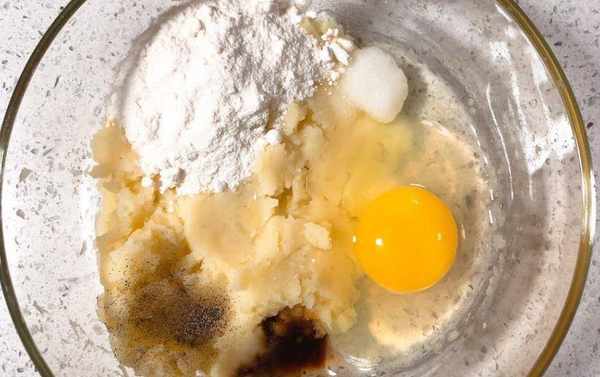 2、將蒸好的土豆壓成泥,加入雞蛋、鹽、黑胡椒碎、面粉攪拌均勻。